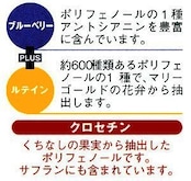 本品ブルーベリープラスは、ブルーベリーの近種であるビルベリー果実抽出物に加え、マリーゴールドから抽出されるルテイン及びクチナシより抽出されるクロセチンを配合した栄養補助食品です。