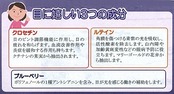 原材料名:DHA含有精製魚油、ビルベリー果実抽出物、黒コショウ抽出物、ゼラチン、グリセリン、グリセリン脂肪酸エステル、クチナシ抽出物、マリーゴールド色素、ビタミンB1、ビタミンB6、ビタミンB2、葉酸、ビタミンB12